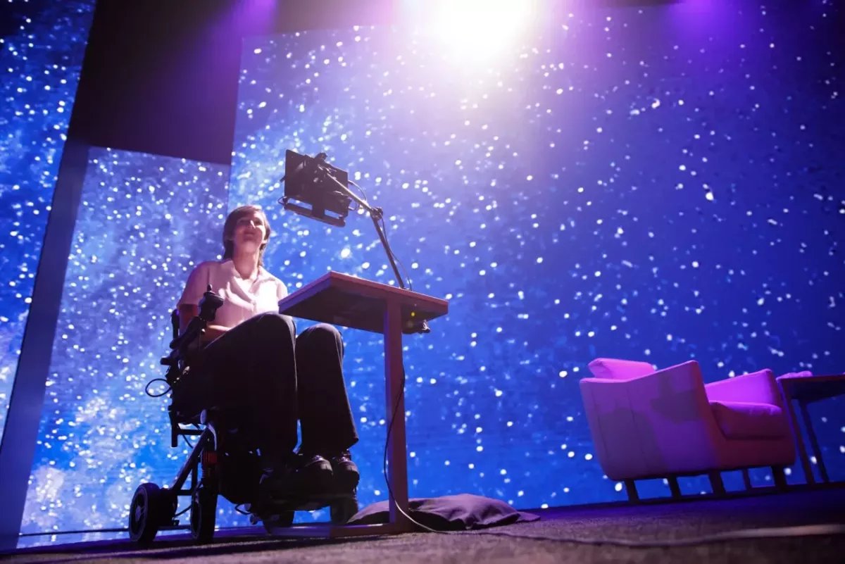 Erin on stage, a digital camera in front of them and a colorful starry sky displayed behind.